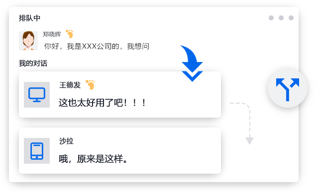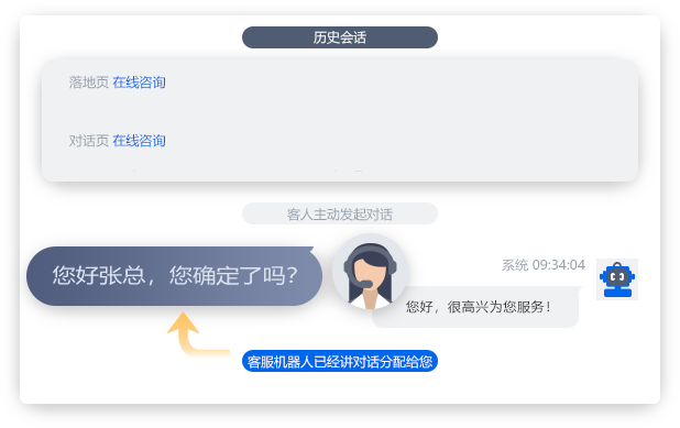 自动识别回头客机制,系统通过调取客户信息、浏览记录、历史聊天信息等方式,判断是否是回头客,推送回上一次和他对话的客服进行二次对话,提高沟通效率。