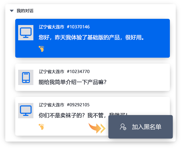 遇到骚扰型且无效客户,客服可将其拉入黑名单,同时也可以随时解除黑名单。避免客服进行无效沟通,提高工作效率。
