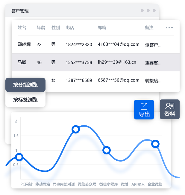 在线客服系统与客户信息管理相结合,通过信息过滤精选出高品质客户,完善信息,让客服更加了解客户,通过数据资料进行判断,同时支持对客户资料的查询、导出、分析等。